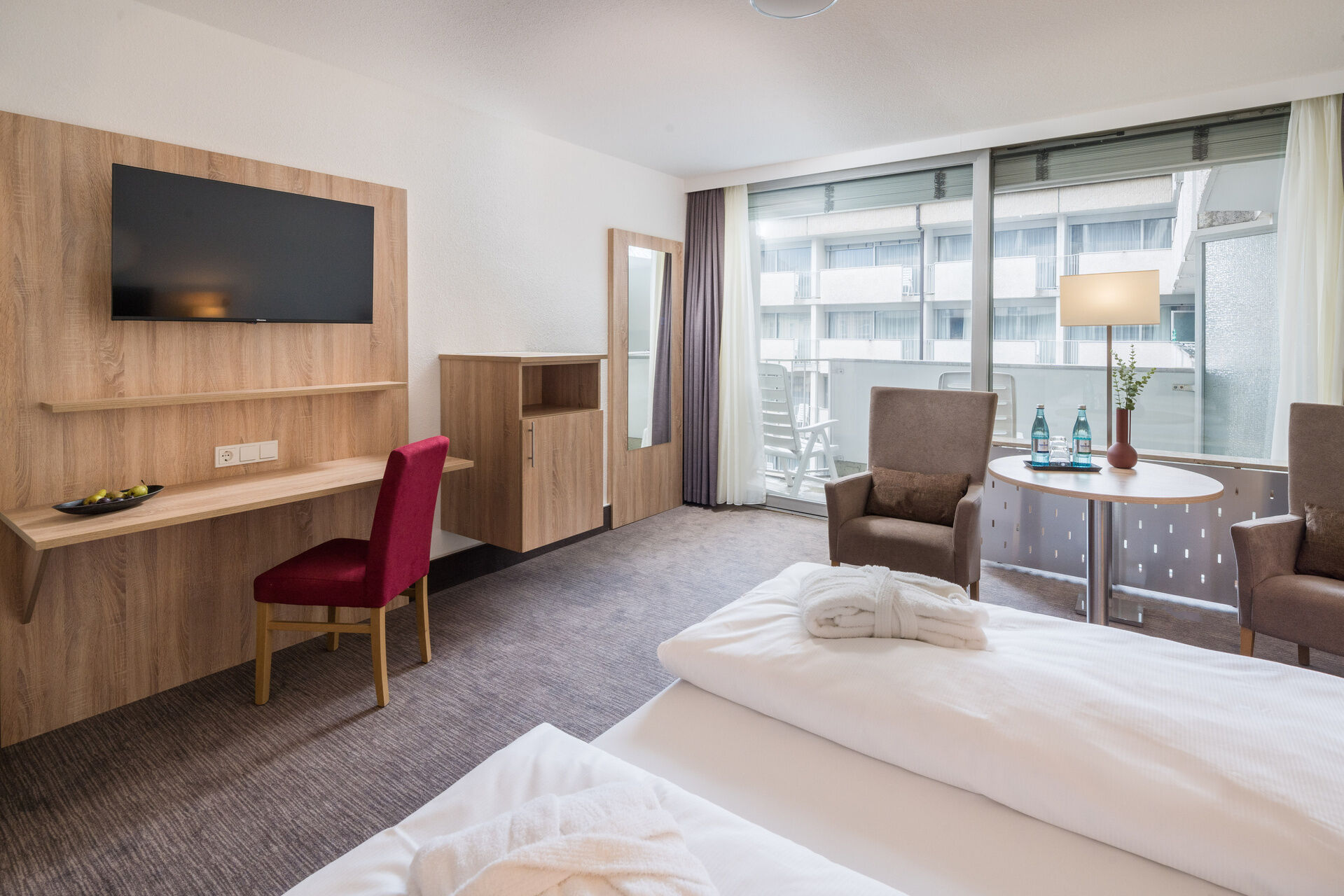 Our double rooms are furnished with a double bed (180 x 200 cm),a desk, comfortable seating area, telephone, mini fridge andflat screen TV with cable TV and Sky.