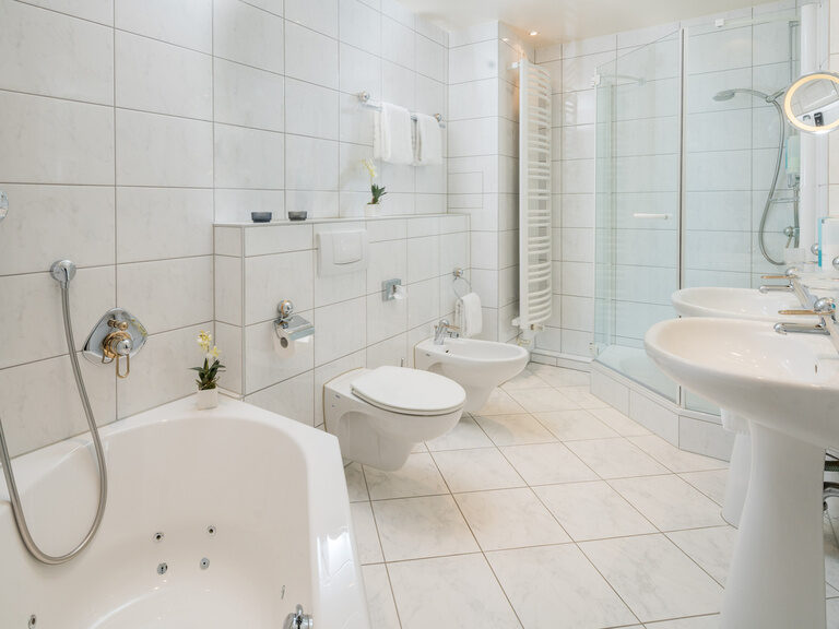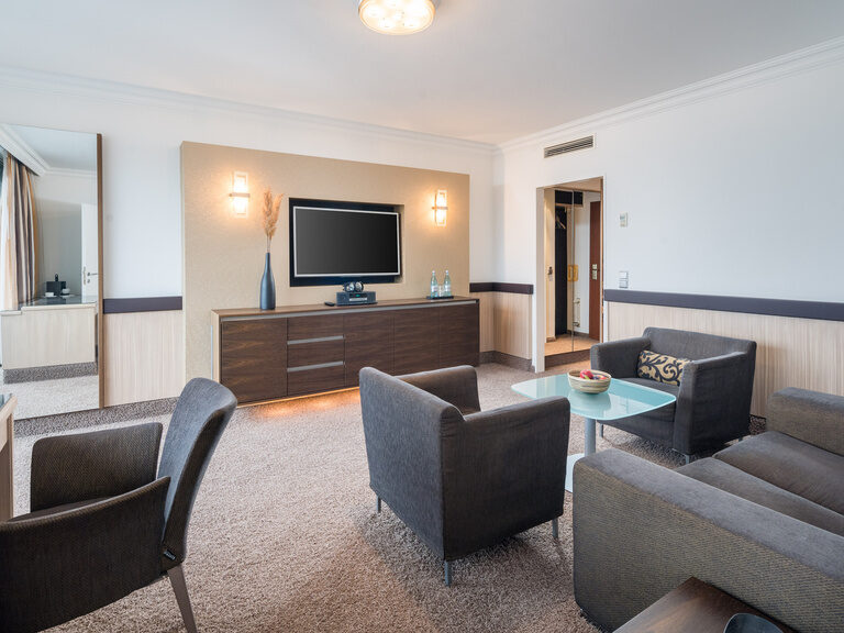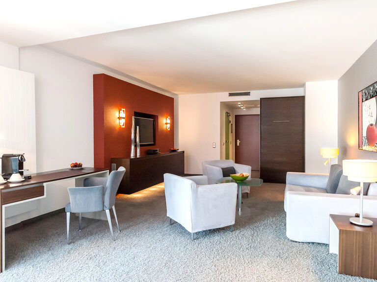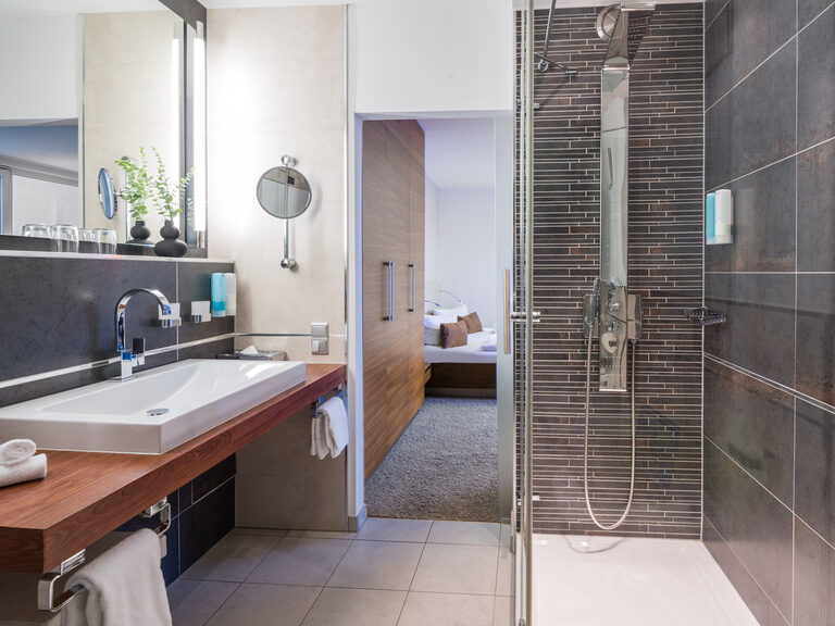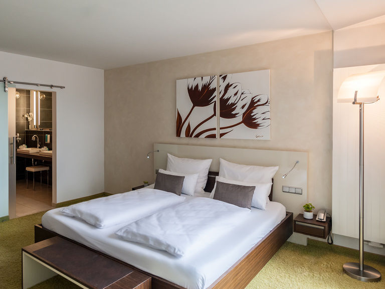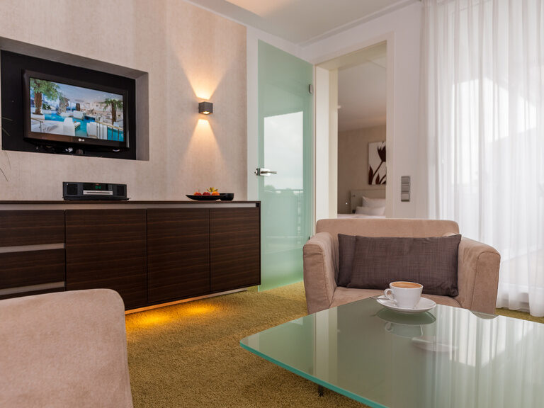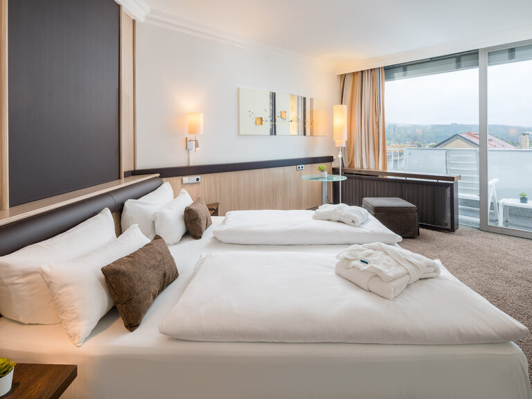 Our Deluxe suite – a gem. Spending the night in Bad Kissingen is a real treat here. In the modern and stylishly furnished suite, you can enjoy a magical view from both the living room and the bedroom. The large terrace or panoramic balcony invite you to relax and while away the hours.